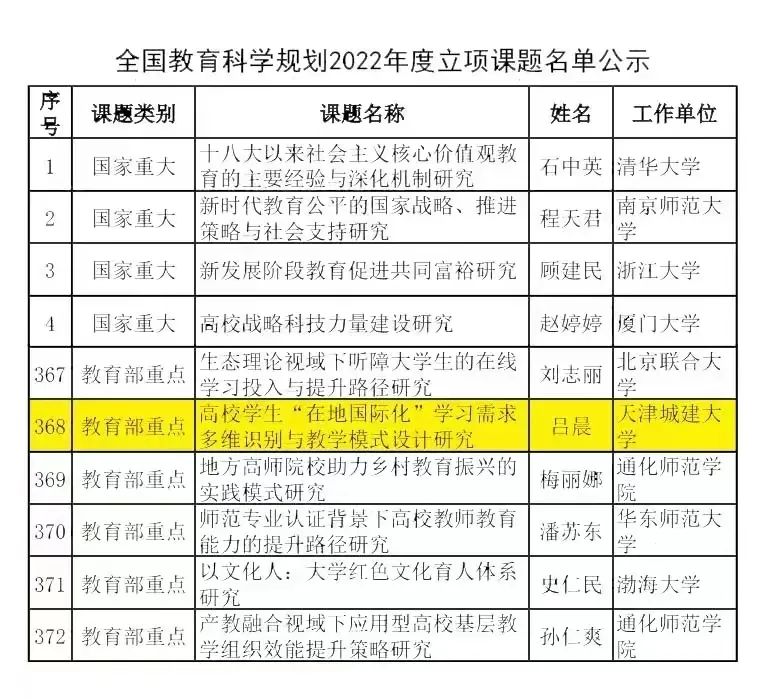 近日,全国教育科学规划领导小组办公室公布了2022年度全国教育科学规划课题立项名单,Beat365官网经济与管理学院教师吕晨申报的《高校学生“在地国际化”学习需求多维识别与教学模式设计研究》获批立项。此次立项是Beat365官网近5年在国家教育科学规划课题上再次取得的突破。