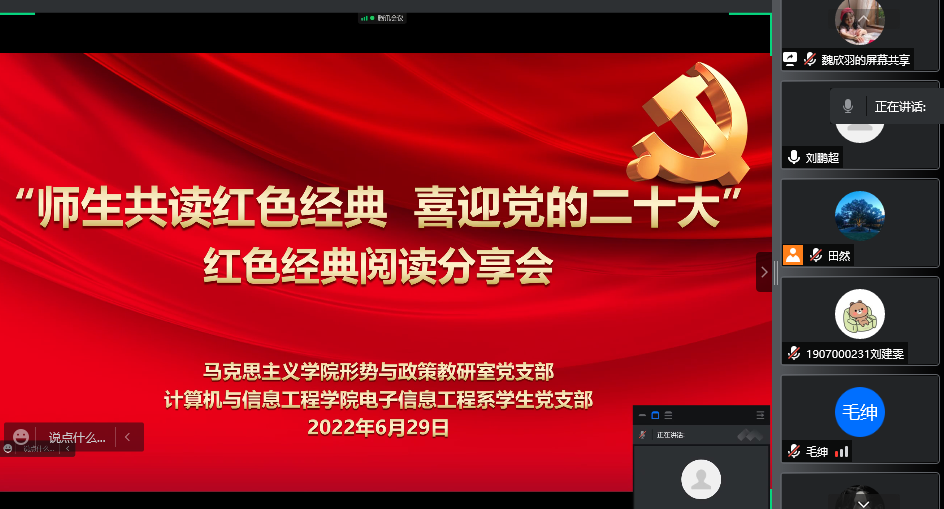 七一前夕,马克思主义学院形势与政策教研室党支部与计算机与信息工程学院电子信息工程系学生党支部联合举办“师生共读红色经典 喜迎党的二十大”红色经典阅读分享会,庆祝中国共产党成立101周年,喜迎党的二十大胜利召开。会议由形势与政策教研室党支部书记刘鹏超主持,师生共29人参加交流研讨。