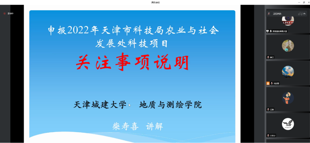 为进一步做好2022年度天津市社会发展与农业领域科技项目申报工作,6月14日,Beat365官网通过线上会议方式举行2022年天津市社会发展与农业领域科技项目辅导及申报工作推动会。本次会议邀请Beat365官网地质与测绘学院柴寿喜教授做项目辅导讲座,Beat365官网教师共计50余人参会。