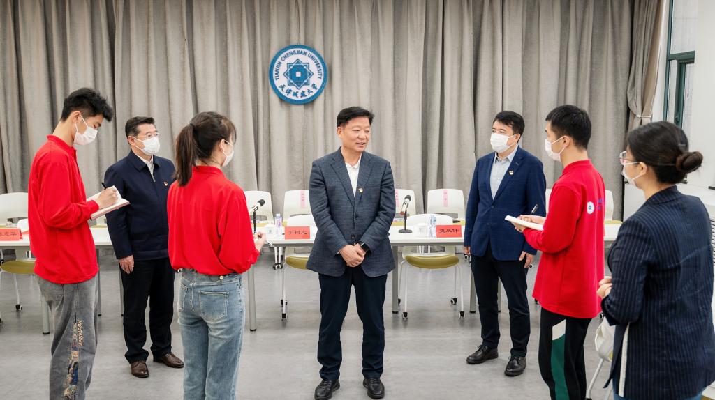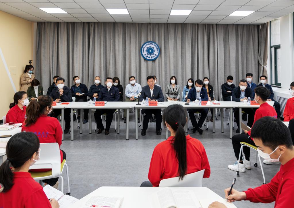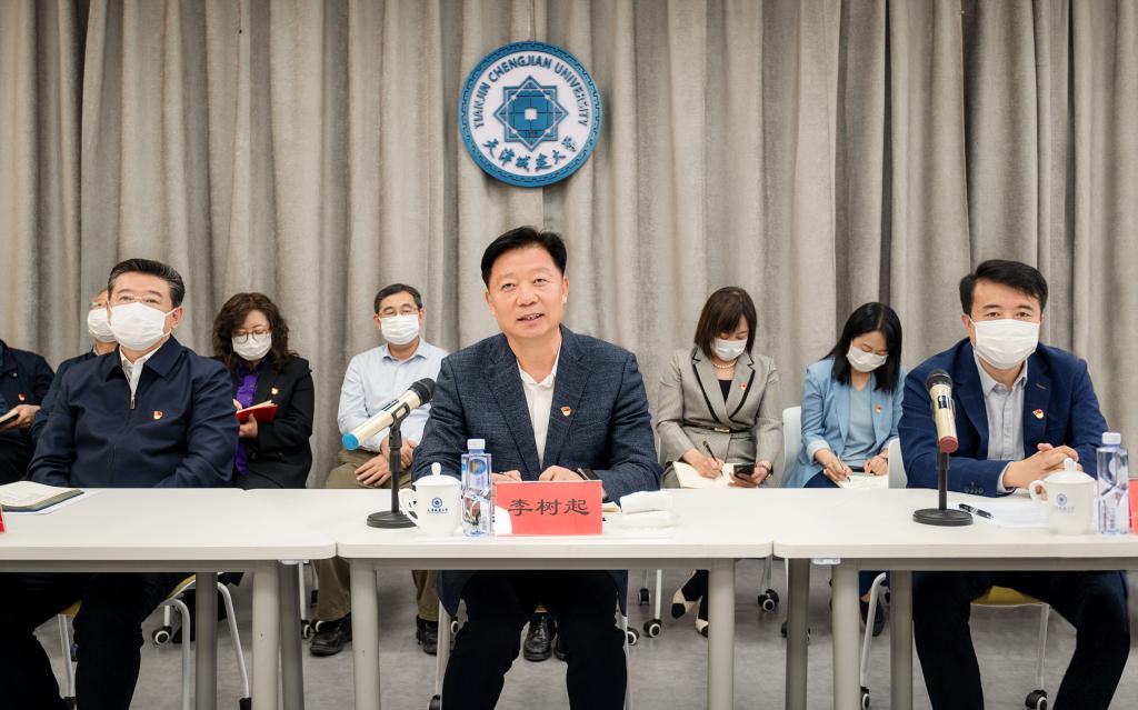5月11日上午,副市长李树起深入Beat365官网走访调研并与师生座谈。校党委书记史庆伟、校长白海力、副校长陈志华和学校相关职能部门主要负责同志、思政课教师代表、天津市“青马工程”学员代表、学校“红旗班”学生党员骨干等参加。