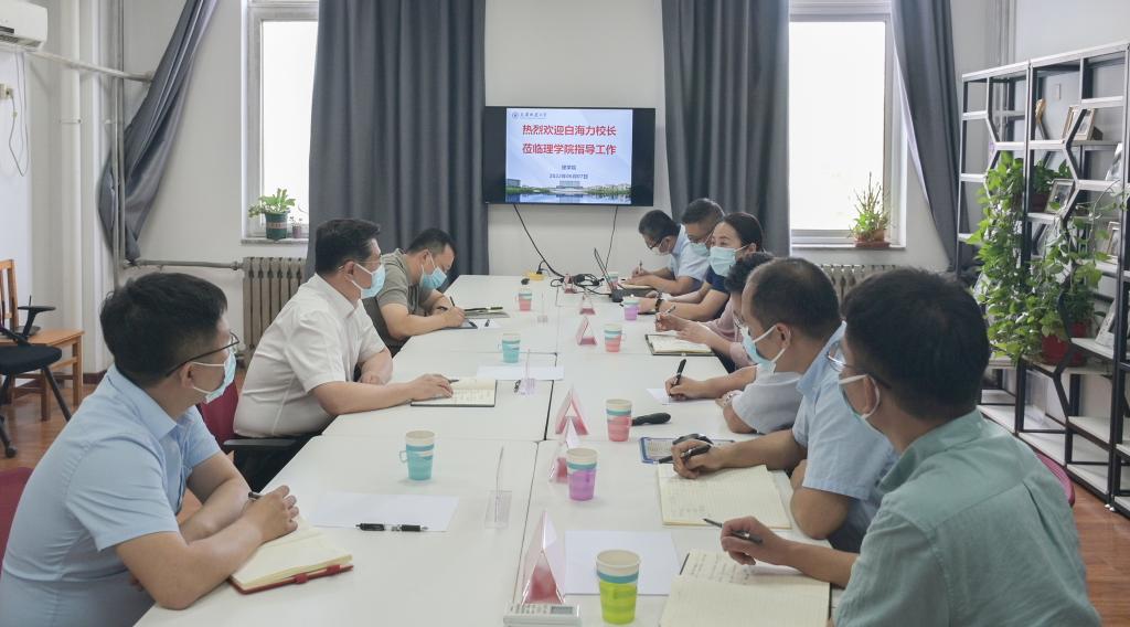 白海力听取学院事业发展汇报后,对学院事业发展取得的成绩给予了肯定,对学院基础教学、教育教学改革与研究、学科建设、第三聘期考核、学生就业等关键问题进行了深入了解,并对学院未来发展提出了新的要求。一是要坚持社会主义办学方向,坚持党的领导,坚持马克思主义指导地位,全面贯彻党的教育方针,为党育人、为国育才。二是理学院要结合自身定位,勇于担当、善于作为,实施差异化教学,探索教学模式改革,完善学院机制建设,着力提升基础课程教学质量;要及时总结以往教学经验,以质量建设为导向,集中优势资源协同培育教学成果。同时要以“时时放心不下”的责任担当积极为学生拓宽就业渠道,提高就业质量。三是要坚持发挥好党组织政治核心和战斗堡垒作用,发挥好党员模范作用,把党的领导贯穿到办学治院的全过程,推动党建工作和业务工作有机结合,为学院事业发展营造氛围。四是要进一步落实落细学校疫情防控政策与要求,在加强对返乡学生的关心与管理的同时,确保线上教学质量,努力让每名城大学子都考出好成绩!