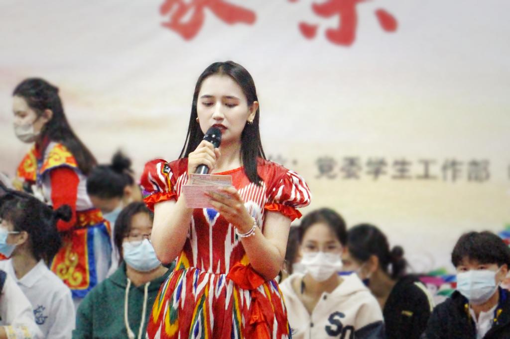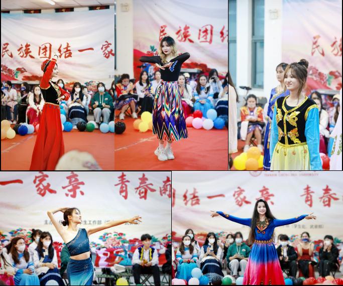 活动现场,民族歌曲悠扬,民族舞蹈飘逸。开场在一曲旋律激昂的《你要跳舞吗》中拉开序幕,点燃欢唱之旅。优美的曲子,曼妙的舞姿,极具新疆风情的舞蹈《舞新疆》《小花帽》《舞韵民风,源源而来》《石榴花开》等舞蹈,为在场师生带来一种能歌善舞的美、一种源远流长的美、一种团结奋进的美。