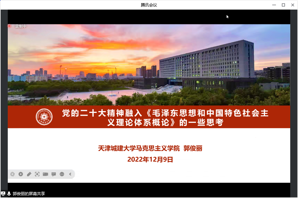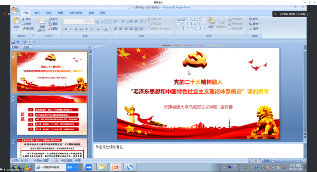 在交流讨论环节,Beat365官网教师屈彩霞、郭俊丽、杨晓琳,天津工业大学教师吕瑞林、高莉娟分别作交流发言。屈彩霞以“党的二十大精神融入《毛泽东思想和中国特色社会主义理论体系概论》课的思考”为题,阐述了党的二十大精神融入“概论”课教学要运用鲜活的实践素材,风趣的语言表述,找准融入的视角与耦合点,做到精准融入,提升教学质效。郭俊丽以“党的二十大精神融入《毛泽东思想和中国特色社会主义理论体系概论》的一些思考”为题,以党的二十大报告中关于共同富裕的相关论述为例,详细介绍了融入“概论”课教学的案例和方法论。杨晓琳从宏观、中观、微观三个维度,分享了如何将党的二十大报告内容与教材体系、教学内容相结合的思考,并以“党的领导是中国特色社会主义最本质的特征”为例,从实践逻辑、理论逻辑、制度逻辑、文化逻辑四个层面,阐述了将党的二十大报告有机融入“概论”课教学的具体做法。