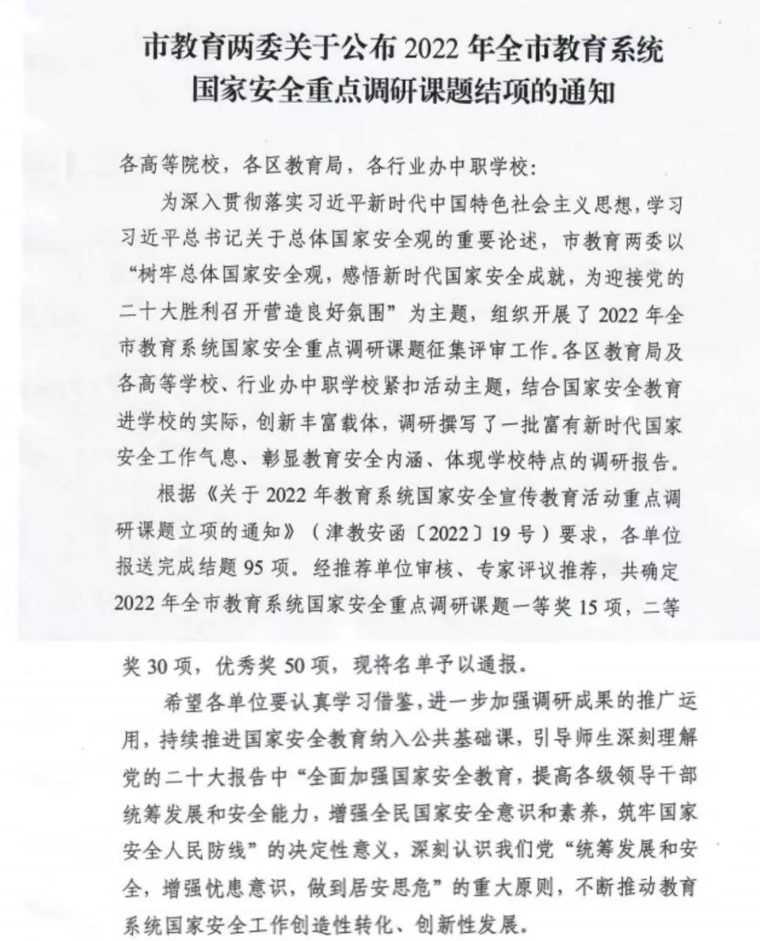 学校将进一步深入开展国家安全宣传教育,不断引导师生深刻理解党的二十大报告中“增强全民国家安全意识和素养,筑牢国家安全人民防线”的决定性意义,深刻认识我们党“统筹发展和安全,增强忧患意识,做到居安思危”的重大原则,不断推动学校国家安全工作创造性转化、创新性发展。