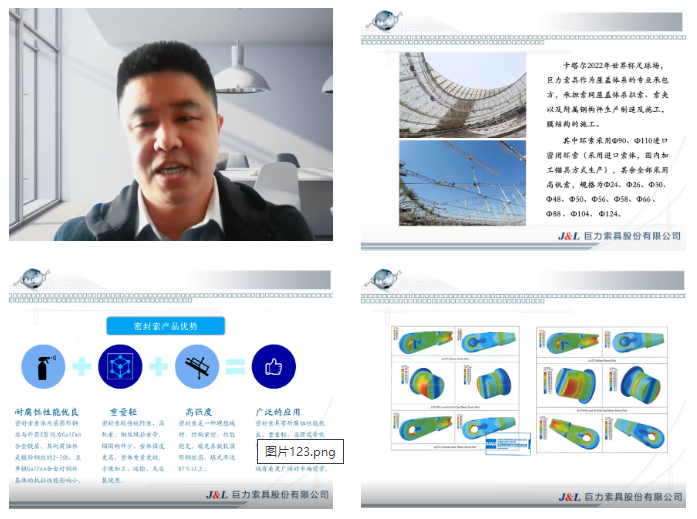 杨冀州做了题为《高性能密闭索制造技术及其在卡塔尔世界杯主赛场结构中的应用》的报告,首先进行了密闭索产品以及卡塔尔卢塞尔体育场项目的介绍,其次详细介绍了锚具材料选用设计和无损检测分析对比等内容,并通过密封索索体及钢丝国内外标准对比和锚具强度计算欧标与新钢规的对比阐述了卢塞尔体育场作为一项海外工程针对不同规范不同标准的应用与对比分析;最后对密闭索发展历程进行了展望。