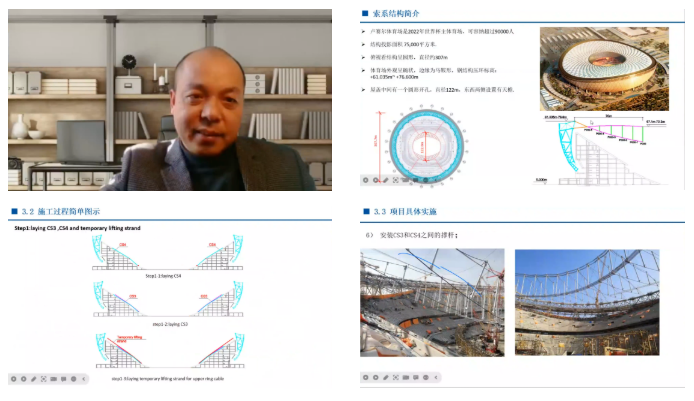 尤德清做了题为《卢塞尔体育场索网屋盖施工关键技术》的报告,从施工角度介绍了索结构在施工现场的施工技术和施工重难点;通过不同方案的对比分析,对施工过程、项目具体实施情况以及拉索成型效果等内容的介绍,阐述了施工重点和难点所在;最后以卢塞尔体育场的索网屋盖施工技术为例,揭示了大跨度柔性索网施工的关键点,为此类项目的施工技术提供了方案和思路。