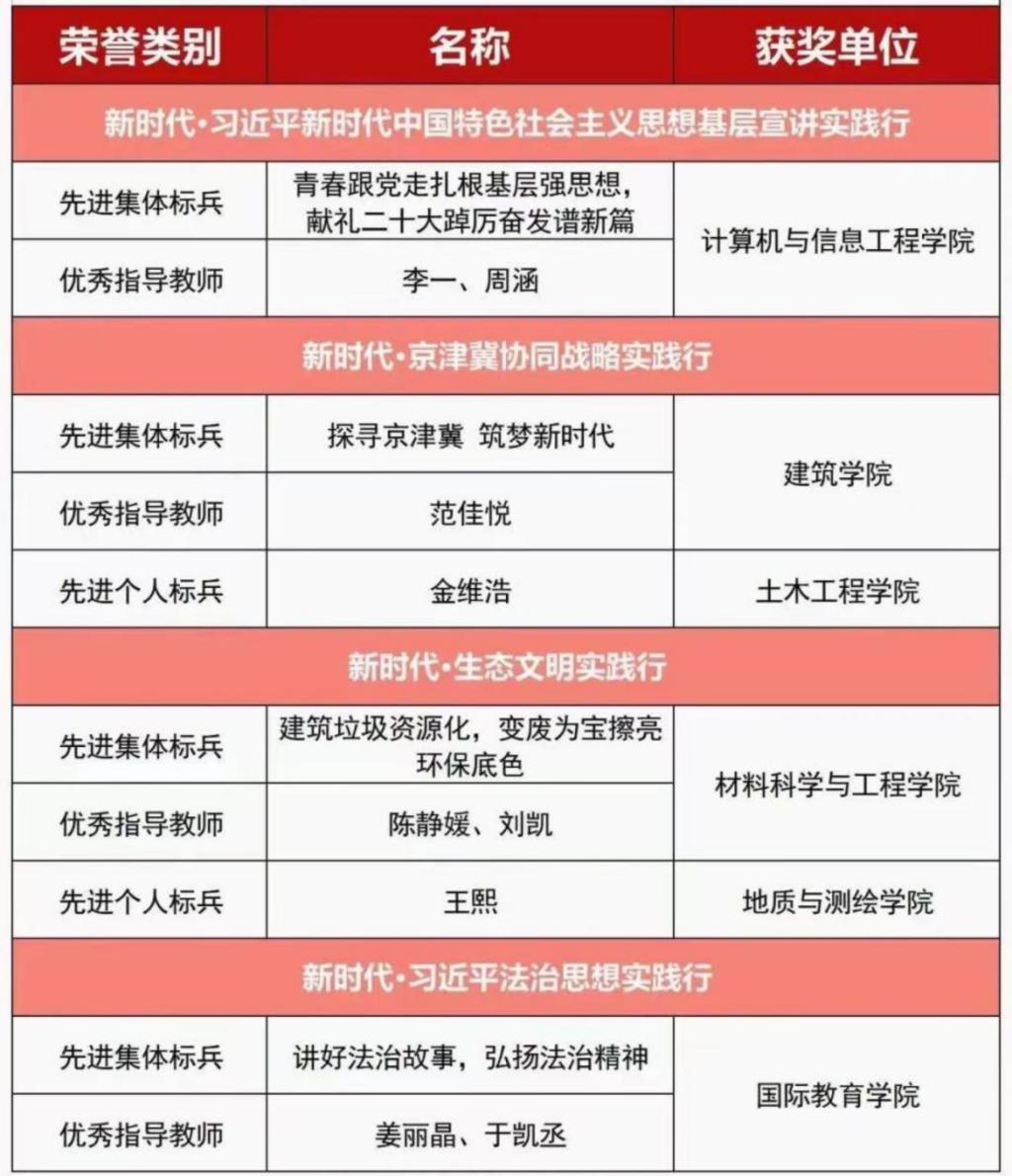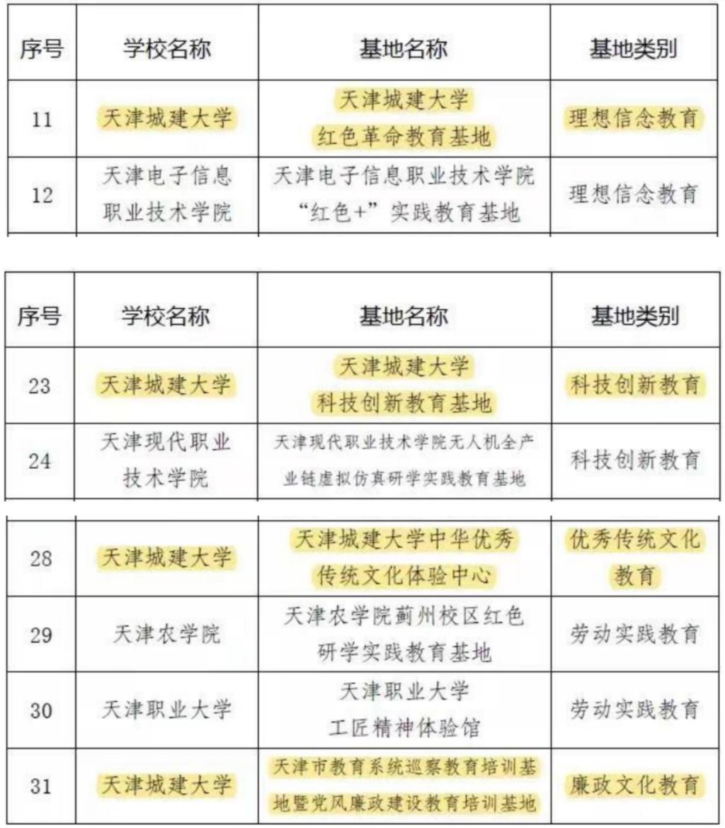 学校2个主题研学线路,获批天津市首批大中小实践育人一体化精品线路,4个类别教育基地,获批天津市首批高校红色研学实践教育基地。“善学善建”城建特色中小学劳动教育实践基地被确定为2022年天津市中小学生劳动教育实践基地。在2022年新时代·实践行活动中,获得天津市先进集体标兵4项、先进个人标兵2项、天津市先进集体1项、先进个人3项、7名教师获评优秀指导教师。志愿服务项目《科技助老,夕阳再晨》荣获天津市青年志愿者项目大赛银奖。学校“青春兴‘城’”“返家乡”实践项目”荣获全国大学生“返家乡”社会实践活动表扬品牌项目,该项目为天津市唯一入选项目。