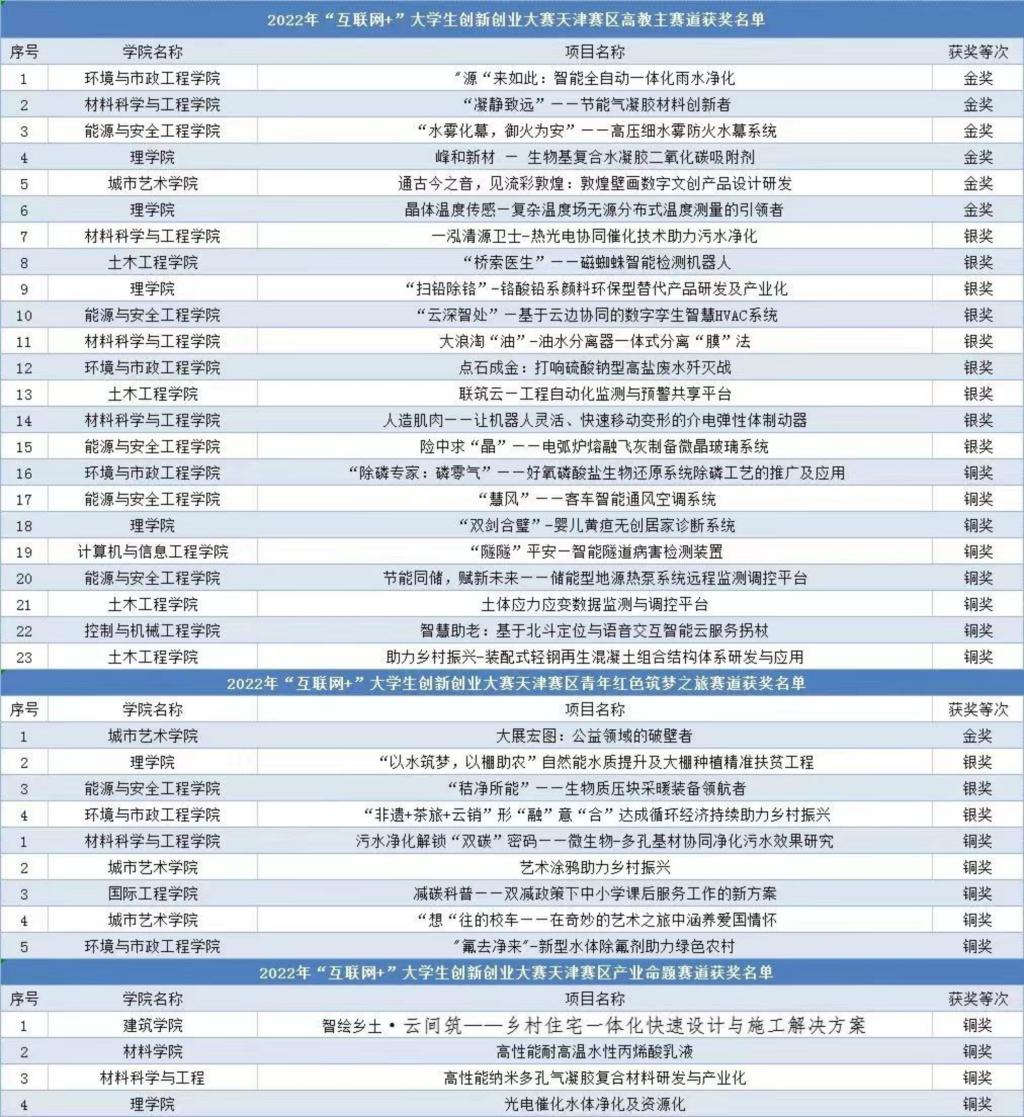 创新创业工作成效显著,学校连续7年获评天津市A级(优秀)高校众创空间。2022年,获批1项天津市创新创业专项课题,获批天津市拔尖项目1项。学校1项国家级大创项目入选第十五届大创年会论文类,天津市仅三家高校入围。荣获省部级以上荣誉300余项,再次获得“优胜杯”和“优秀组织奖”。第八届“互联网+”大学生创新创业大赛天津赛区金奖7项、银奖12项、铜奖17项,其中,有3个项目入围国赛,为学校历届“互联网+”大赛最好成绩。