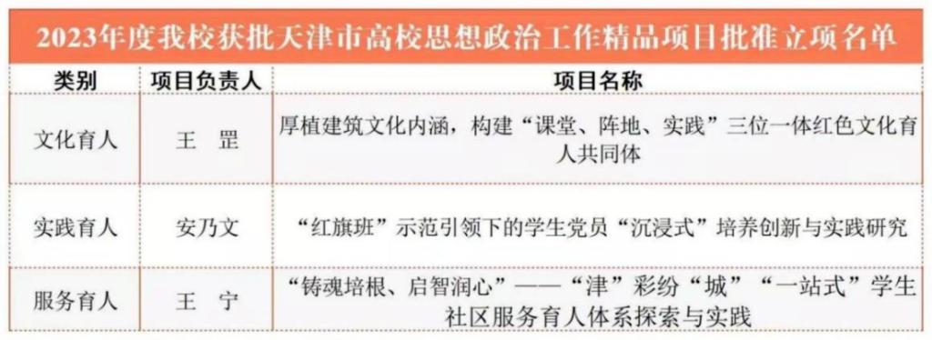 持续强化辅导员队伍建设,1人获批2022年度天津市高校思想政治工作精品项目结项优秀;2人获批2023年度天津市高校思想政治工作精品项目;3人获批天津市大中小思想政治工作专项课题;4项就业工作案例入选《天津市高校毕业生就业观教育工作典型案例集》;在天津市高校辅导员思想政治教育“精彩一课”视频公开课大赛、天津市2022年大中小学爱国主义教育优秀案例征集评选活动中斩获佳绩。全面提升思政课教师教学能力、科研能力,通过“菜单式”理论宣讲、思政课堂融入、集体备课,共开展各类理论宣讲、集体备课、学术报告154场。在天津高校第十六届青年教师教学竞赛、天津市思政课教学比武、天津市爱国主义教育优秀案例“高校组优质课程”中斩获多项荣誉,获批2022年天津市思想政治理论课常设课题7项。