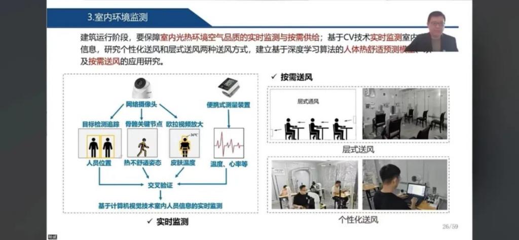 杨斌教授首先从《荀子·正名》出发介绍了目前建造环境监测与调控所面临的主要问题以及人工智能技术的发展历史,包括机器视觉识别、视频微变放大、机器学习、图像分割等;随后对人工智能技术在建筑环境领域的应用进行了介绍,包括建造过程危险行为监测、基于GIS系统的城市热岛识别、基于视觉的热不适行为识别、个性化通风调节以及睡眠健康监测、机房自动巡检、换热器异常检测等研究;最后对人工智能技术在建筑环境领域的应用发展进行了展望。讲座最后,杨斌教授同参会老师与同学们就教学课程设置、科学研究发展、数据隐私保护等问题展开了热烈讨论。