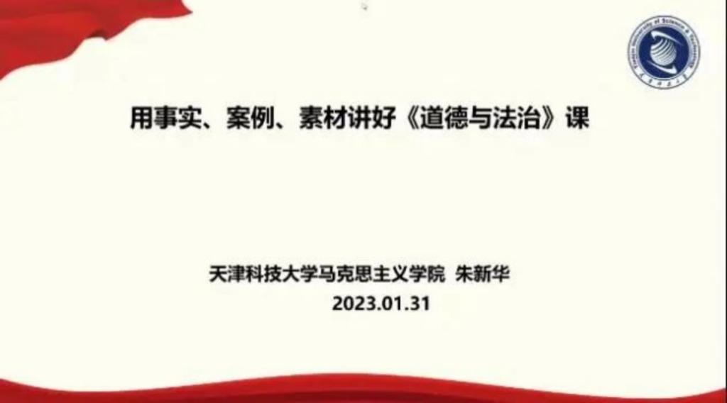 培训活动中,天津科技大学马克思主义学院院长朱新华教授以“用事实、案例、素材讲好《思想道德与法治》”为题,回顾了全面依法治国的历程,并结合经典案例,就如何将教材语言转换为教学语言进行深入的讲授。