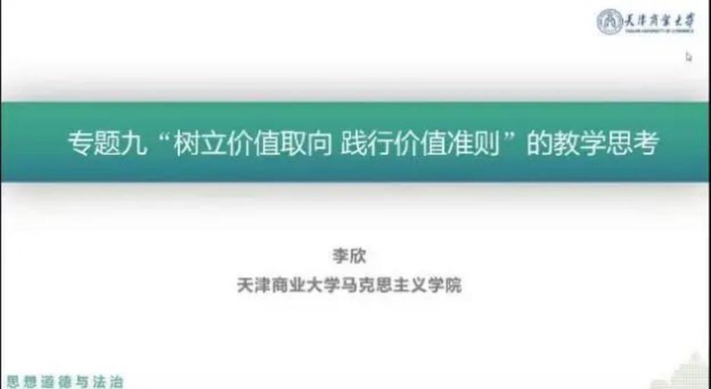 天津商业大学马克思主义学院思想政治教育教研部主任李欣以“专题九:树立价值取向 践行价值准则的教学思考”为题,从教学目标、教学内容与教学资源的运用三个方面进行分享,并结合了党的二十大报告中的具体论述和具体案例,深入介绍了如何将“社会主义核心价值观的显著特征”讲深、讲透、讲活。