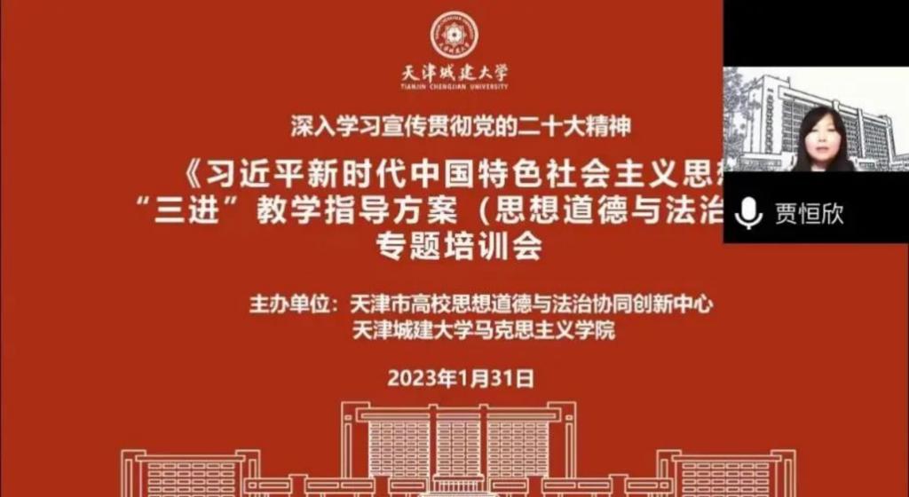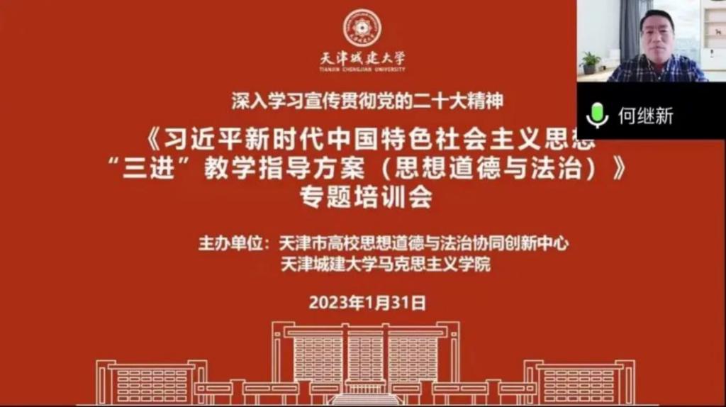 1月31日,由天津市高校思想道德与法治协同创新中心、Beat365官网马克思主义学院组织开展的党的二十大精神“三进”教学指导方案培训会暨《习近平新时代中国特色社会主义思想“三进”教学指导方案(思想道德与法治)》专题培训会在线成功举行。此次活动邀请了“三进”教学指导方案编写组的6位专家教师作专题培训,来自天津市各高校“思想道德与法治”课骨干教师300余人参加培训学习。培训会由马克思主义学院副院长贾恒欣主持。