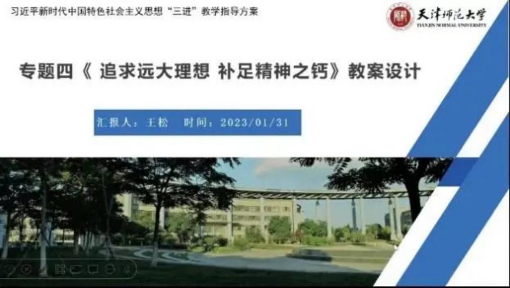 天津师范大学马克思主义学院教师王松围绕“专题四:追求远大理想 补足精神之钙”对“三进”教学指导方案的内容结构进行了介绍,从理论融入和故事融入两个维度讲授了将党的二十大精神融入教学内容的方式方法。