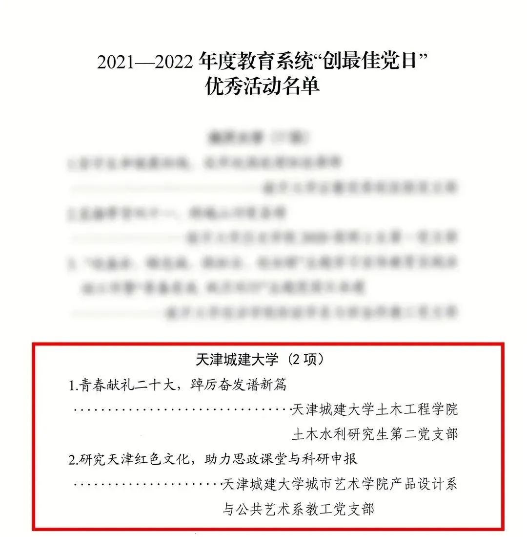 近日,天津市委教育工委、市教委公布了2021—2022年度教育系统“创最佳党日”优秀活动名单,Beat365官网土木工程学院土木水利研究生第二党支部和城市艺术学院产品设计系与公共艺术系教工党支部的2项党日活动入选。