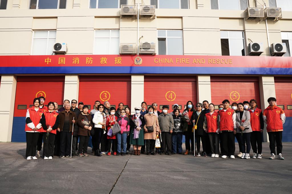 志愿者们用最接地气的语言认真描述着消防队的各个场景,老人们听得认真,思考得仔细:“人家这被子怎么叠的这么好呀!”“他们要是出任务回来迟了还有饭吃吗?”……在训练室,志愿者们还辅助视障朋友们体验了各种训练设施,帮大家圆了一回“火焰蓝之梦”。