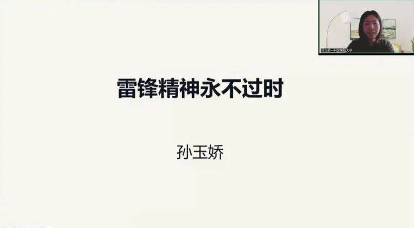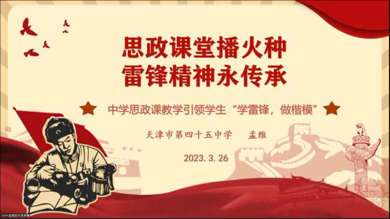 天津市第四十五中学教师孟维,以《思政课堂播火种雷锋精神永传承》为题,从坚定理想信念、增强价值认同、强化优良作风三个方面分析了雷锋精神融入中学思想政治教育的时代价值,并结合具体教学工作,分享了将雷锋精神融入中学思政课,引领青少年学雷锋的方法和路径。