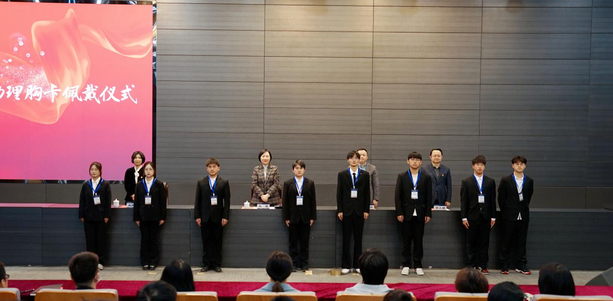 参会领导为第四届学生校务助理代表佩戴胸卡,勉励全体学生校务助理要在今后的工作中铭记这一庄严时刻,对即将开始的岗位实习实践树立坚定信心,做好充分准备,以饱满的热情投入到工作中去。