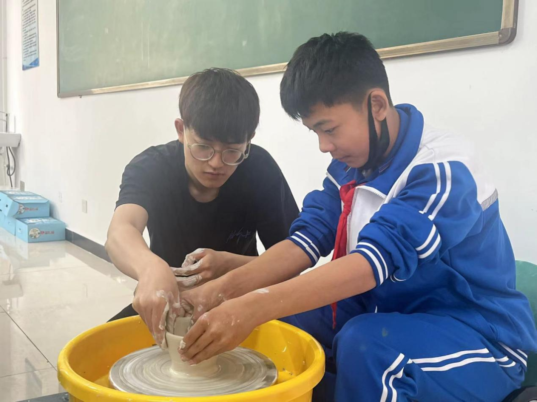 李计元以展板的形式向同学们开展了陶瓷基础知识普及,用实物讲解了陶瓷器具,带领同学们现场体验了陶瓷拉坯、成型与制作,并向王卜庄小学赠送精心制作的陶瓷制品10余件,用于支持活动站的运行。