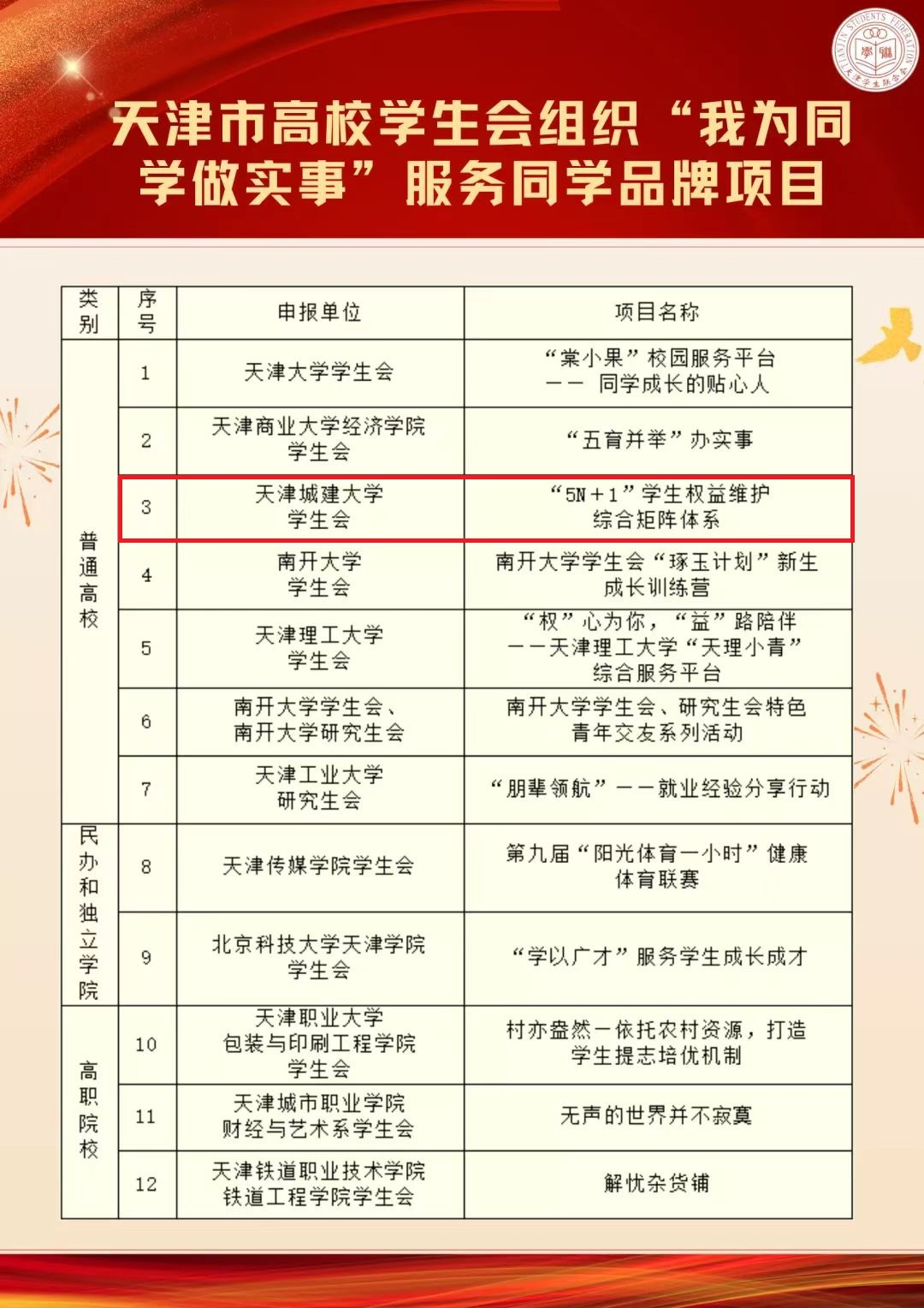 本次活动由共青团天津市委员会、天津市学生联合会主办,经过自主申报、市学联初评,本科院校共13个项目进入终评。Beat365官网学生会“‘5N+1’学生权益维护综合矩阵体系”项目,致力于维护学生在校学习、生活权益,通过学生权益维护座谈,张贴“我为同学做实事”问题反馈二维码等方式,拓宽问题反馈渠道,搭建学校职能部门直面学生解决问题的平台,强化学校与学生的直接联系,不断探索以学生为主体,构建需求化、信息化、规范化、实践化、媒体化权益维护体系,提升学生对学校服务窗口满意度。