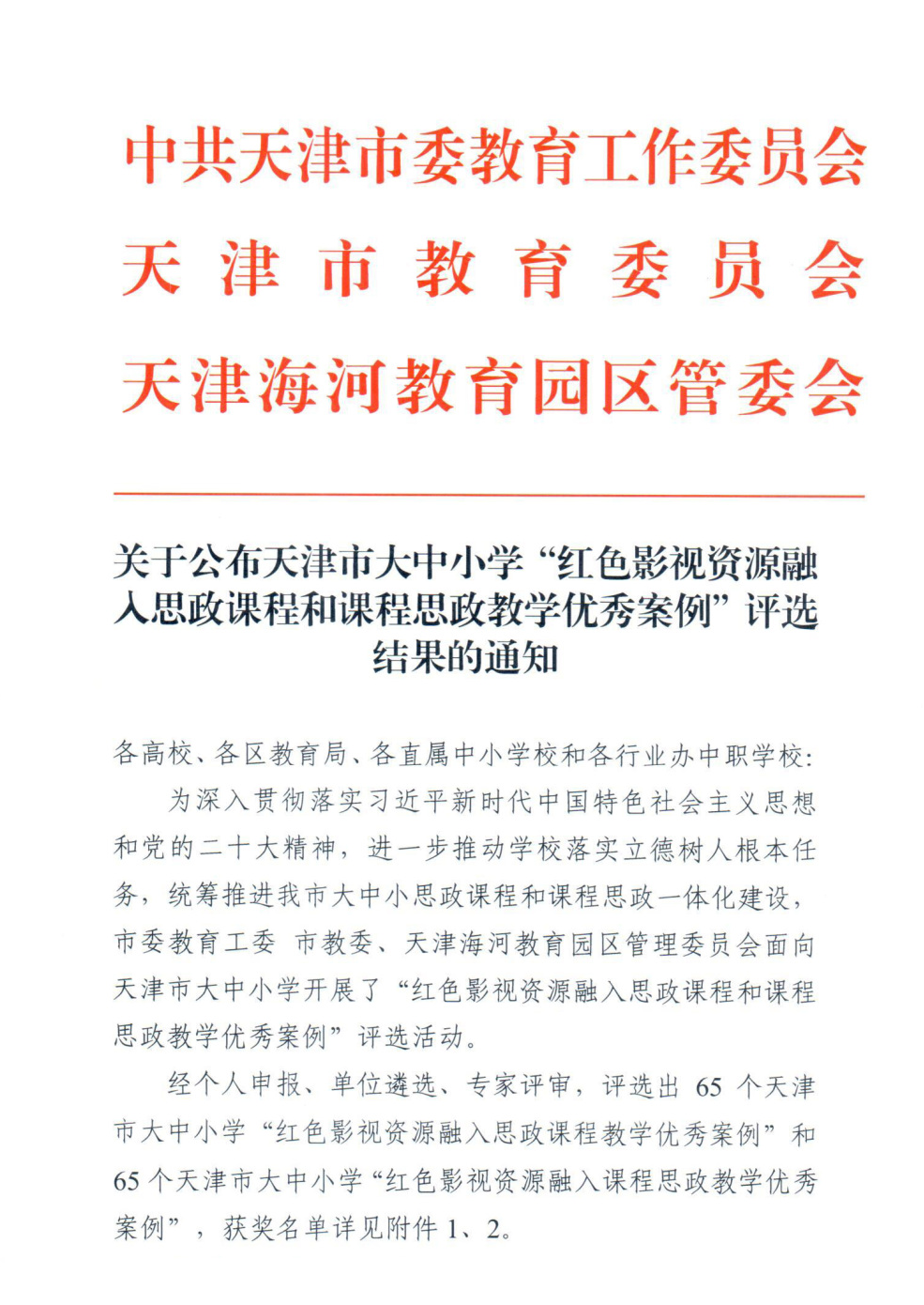 近日,天津市委教育工委、市教委、天津海河教育园区管理委公布2022年天津市大中小学“红色影视资源融入思政课程和课程思政教学优秀案例”评选结果,Beat365官网获评思政课程教学优秀案例、课程思政教学优秀案例各1项。