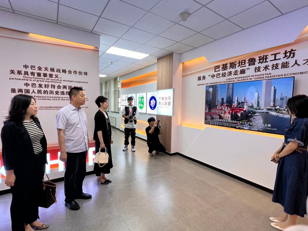 在天津现代职业技术学院,国际交流处主任张颖详细介绍了巴基斯坦第一家鲁班工坊建设情况、农机特色专业和发展成效,带领边菁华一行参观了海河教育园区思想政治教育实践基地。边菁华表示巴基斯坦鲁班工坊“0.5+2+0.5”中巴联合培养“双证书”育人模式值得借鉴与学习,不但可以助力“一带一路”沿线国家当地机械化应用推广、技术创新,还可以推动中国新产品、新技术走出去,希望两校未来在机械自动化、智能制造等专业开展留学生联合培养方面的合作。