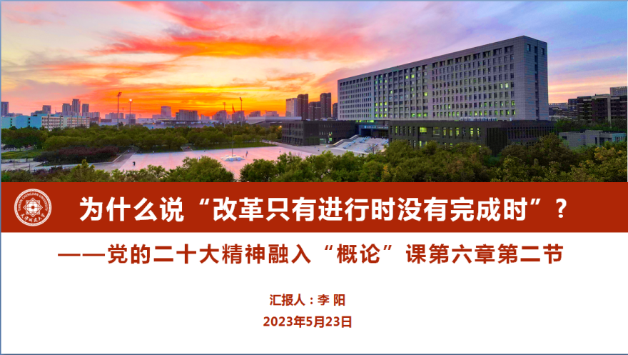 备课会上,马克思主义学院青年教师李阳以《为什么说“改革只有进行时没有完成时”?》为题,从理论依据、历史依据、现实依据三个层面,以问题链的方式,围绕“为什么要改革、改革改什么” “改革为什么好、为什么行” “改革为什么要全面、要深化”进行了深入阐释,分享了将党的二十大精神融入“毛泽东思想和中国特色社会主义理论体系概论”课的教学思考。王中良充分肯定了思政课教师备课发言的理论深度,并强调,新时代新征程思政课高质量发展要以守正创新、协同精准为导向,聚焦教师和学生两个环节,凝聚新共识、激发新动能、构建新格局,继续书写铸魂育人奋进篇章。
