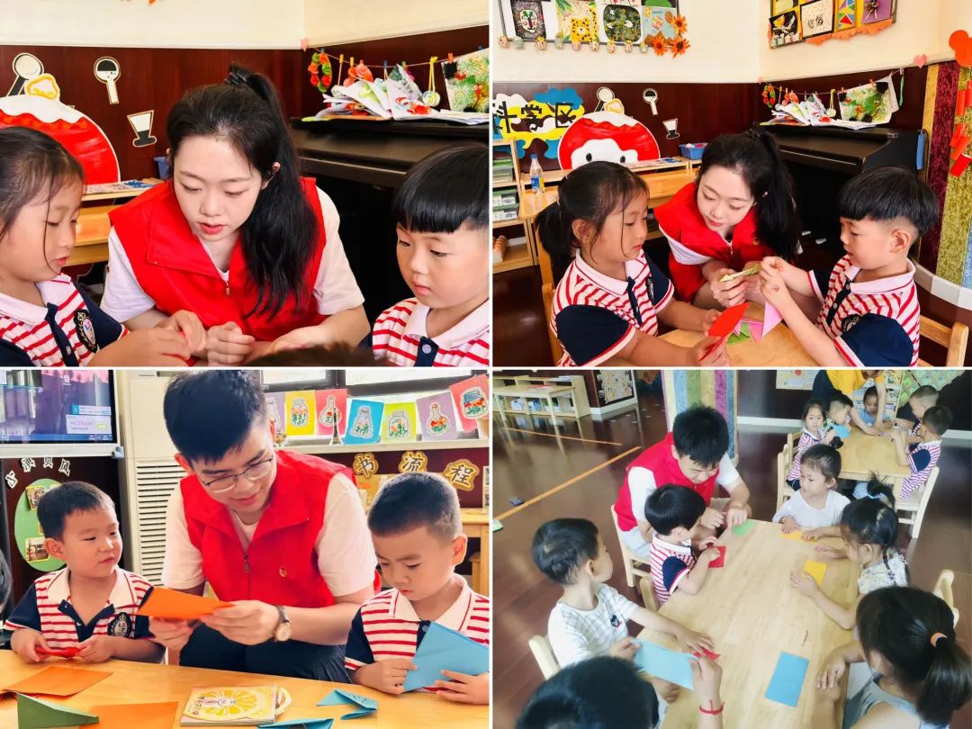 在红色折纸活动中,刘江涛、王立泽同学立足儿童特点,精心设计活动,带领儿童们折红船,贴红星,表达赤子之心。