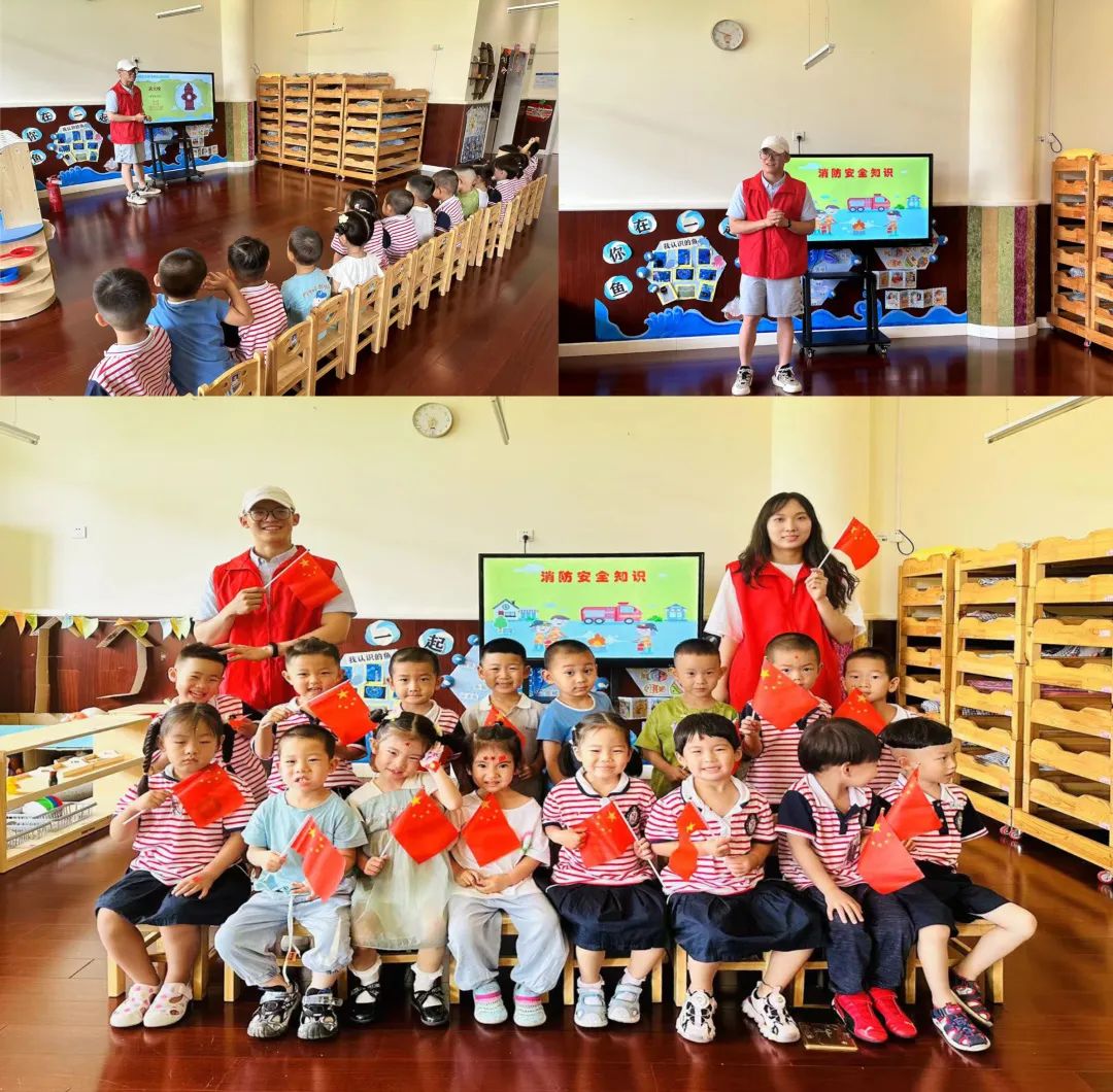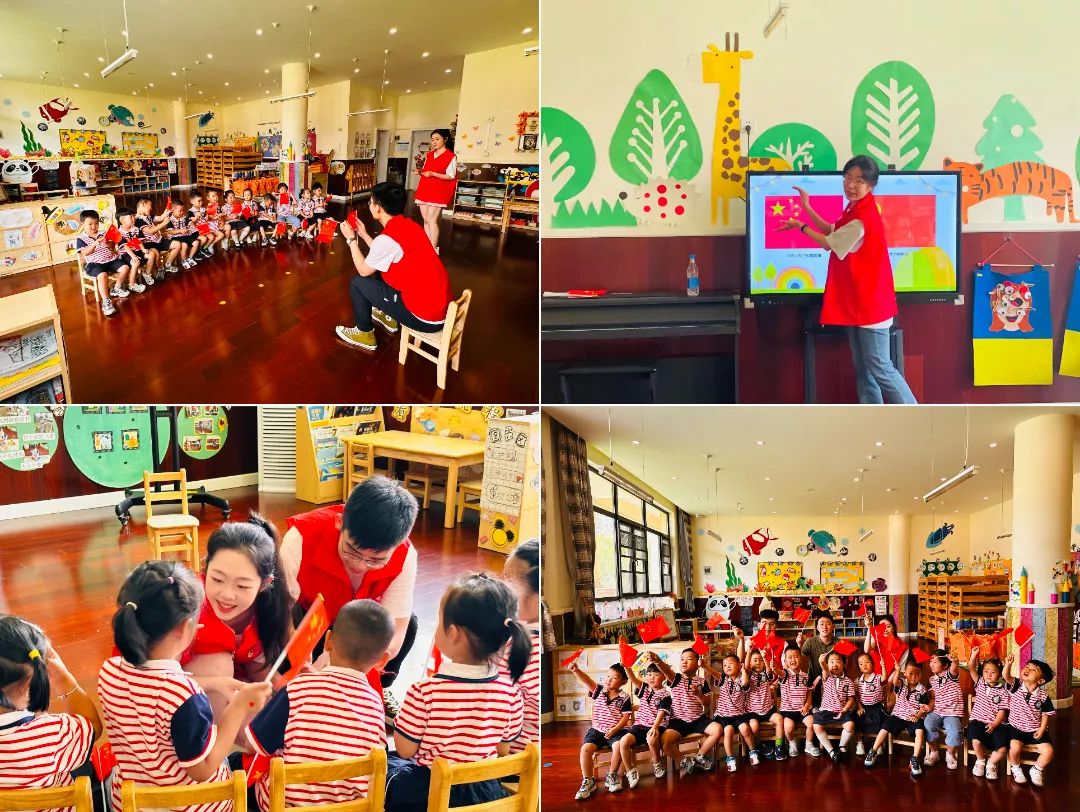 在红色知识小课堂中,参与实践的学生李姿函、席春浩通过图片、视频等形式向幼儿讲解了党旗、国旗的含义和钟南山院士和袁隆平爷爷等英雄模范的故事,并带领小朋友们一起学唱儿歌《有个国家》来表达心中对祖国清澈的爱。