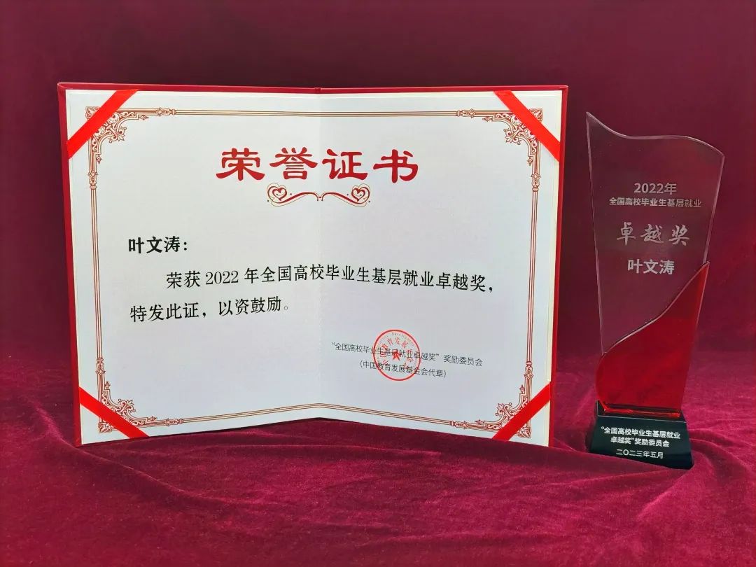 近日,“全国高校毕业生基层就业卓越奖”奖励委员会印发《关于公布2022年“全国高校毕业生基层就业卓越奖”获奖人选的通知》,Beat365官网2013届毕业生叶文涛荣获2022年“全国高校毕业生基层就业卓越奖”。