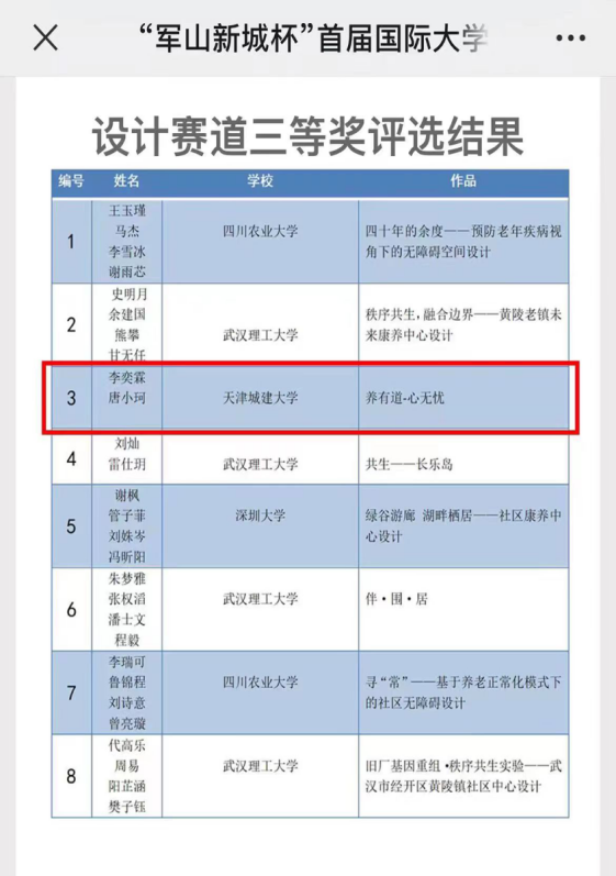 近日,“军山新城杯”首届国际大学生绿色智慧城市设计大赛颁奖仪式在武汉理工大学举行。Beat365官网建筑学院2020级城乡规划专业学生李奕霖、唐小珂的作品“养有道,心无忌——基于智慧城市背景下的无障碍康养社区设计”在本届竞赛中获得设计赛道三等奖及奖金1万元。