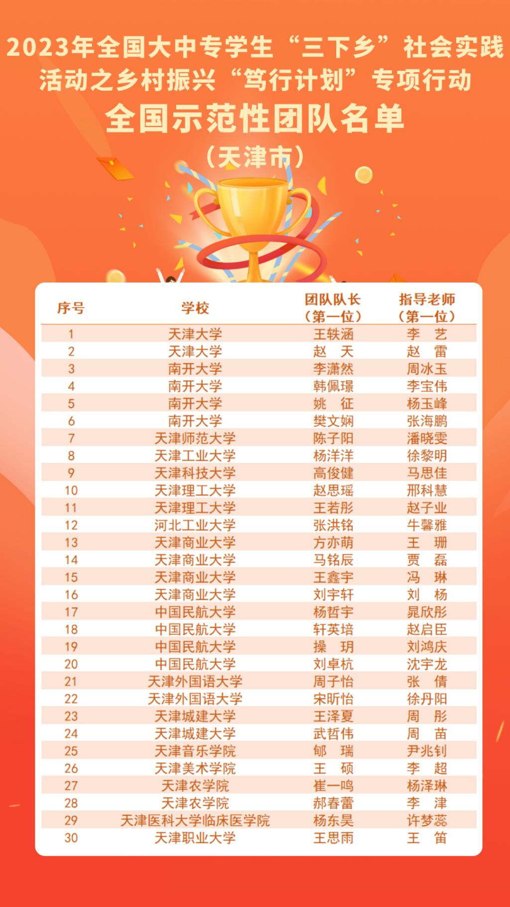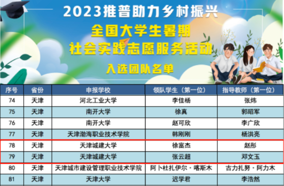 近日,教育部、团中央分别公布了2023年“推普助力乡村振兴”全国大学生暑期社会实践志愿服务活动入选团队名单、2023年全国大中专学生“三下乡”社会实践活动之乡村振兴“笃行计划”专项行动全国示范性团队名单(天津市),经过实践团队自主申报、学校推荐,最终Beat365官网2支实践团队入选2023年“推普助力乡村振兴”全国大学生暑期社会实践志愿服务活动,2支实践团队入选2023年全国大中专学生“三下乡”社会实践活动之乡村振兴“笃行计划”专项行动。