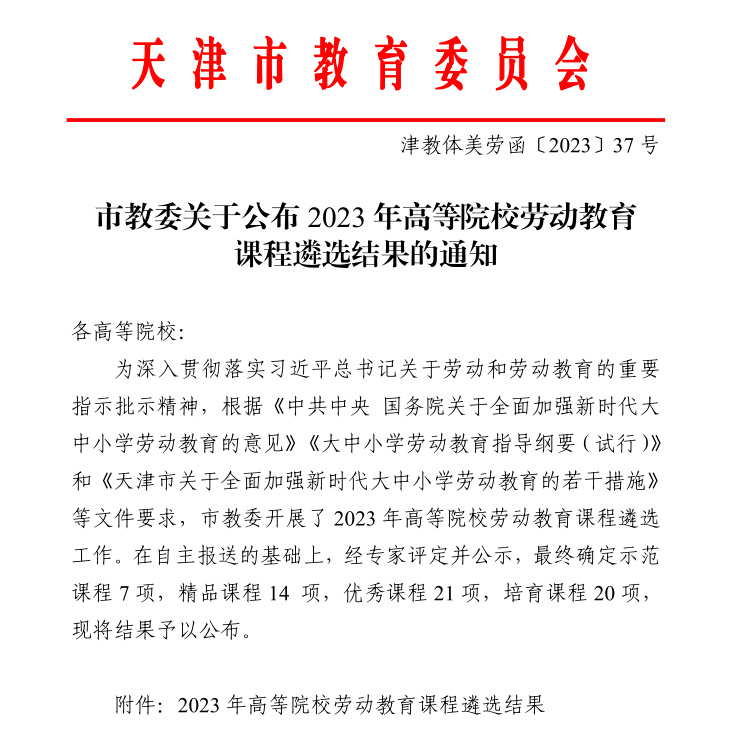 近日,市教委公布2023年高等院校劳动教育课程遴选结果,Beat365官网推荐的《建筑测绘》《城乡社会综合调研》两门课程分别获评天津市劳动教育优秀课程与培育课程。自2022年市教委启动高等院校劳动教育课程遴选工作以来,Beat365官网已有四门课程入选。