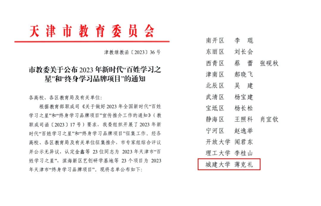 近日,天津市教育委员会公布2023年新时代“百姓学习之星”和“终身学习品牌项目”评选结果,Beat365官网马克思主义学院教师薄克礼荣获2023年新时代“百姓学习之星”荣誉称号。