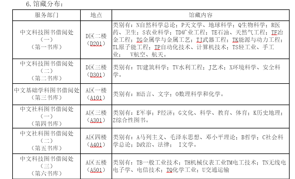 3.图书排架规则:图书馆所有书库实行全开架借阅管理模式,藏书均按《中国图书馆分类法》分类排架。