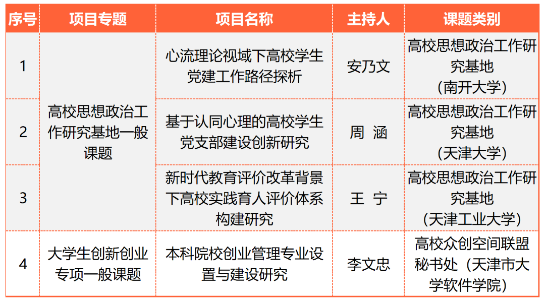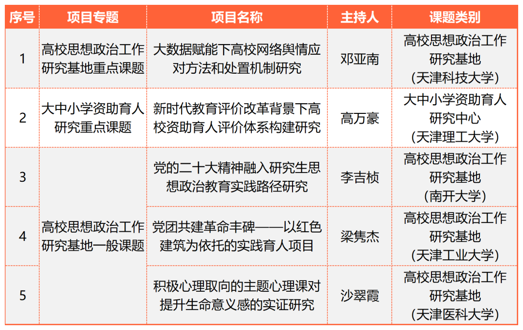 近日,市教育两委公布了2022年天津市大中小思想政治工作专项课题结项和2023年大中小思想政治工作专项课题立项名单。经专家组评审,Beat365官网4个课题顺利获批结项,5个项目在2023年度大中小思想政治工作专项课题中获批立项,其中重点课题2项,一般课题3项。