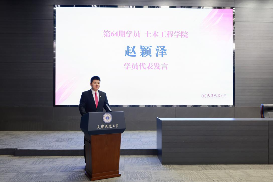 土木工程学院赵颖泽代表全体党校培训班学员发言,表示将以饱满的热情和实际行动完成好党课学习,在学习实践中提升思想觉悟,在知行合一中淬炼党性修养,以专业所学赋能服务发展,把自己锻炼成符合党和人民期望的合格的社会主义建设者和可靠接班人。