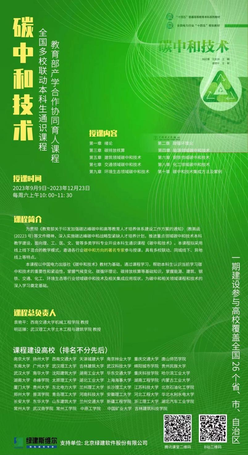 据悉,《碳中和技术》公开课的出台背景为贯彻《教育部关于印发加强碳达峰碳中和高等教育人才培养体系建设工作方案的通知》(教高函〔2022〕3号)等文件精神,深入实施碳达峰碳中和战略型紧缺人才培养计划,推进重点领域碳中和技术本科教学建设。课程定位为面向不同学科、不同专业、中高年级本科生开设的一门线上、线下大平台公共通识课程。该公开课由全国26个省、市、自治区的55所大学共同参与课程建设,并采取“多校联动、异地线上、同城线下”的教学模式。