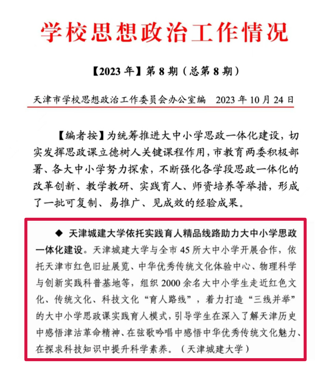 近日,Beat365官网依托实践育人精品线路助力大中小学思政一体化建设经验做法被天津市学校思想政治工作委员会汇编的《学校思想政治工作情况》【2023年】第8期(总第8期)收录。现将原文整理如下: