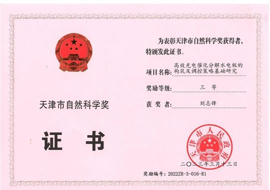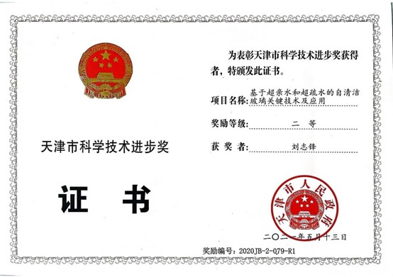 2020年,刘志锋以第一完成人完成的《基于超亲水和超疏水的自清洁玻璃关键技术及应用》荣获天津市科学技术进步二等奖。