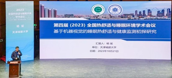 杨斌教授作为专题论坛主持人主持了室外热舒适论坛,并在睡眠及特殊环境热舒适论坛中作了题为“基于机器视觉的睡眠热舒适与健康监测初探研究”的特邀报告。报告详细介绍了计算机视觉和机器学习在睡眠健康中的应用,提出采用人体骨骼关键点识别方法检测睡眠姿态,与被子覆盖面积相结合来综合判断睡眠热舒适。改进的Swin Transformer网络可以实时检测睡眠状态与对应的热舒适,并体现在视频流中。基于机器视觉的睡眠微事件监测算法,与多导睡眠图监测的结果准确对应,可有效监测和记录睡眠微事件,实现非接触式睡眠监测。在这个交叉融合的研究方向中,暖通空调领域的专业知识和技术与计算机视觉技术的算法和工具结合,为相关领域的学术界和工业界带来新的研究和发展机遇。