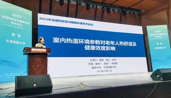 郭淼在特殊人群热舒适论坛中作题为“室内热湿环境参数对老年人热舒适及健康效度影响”的学术报告。报告中引入医学领域中的虚弱等级,将老年人按照生物年龄分级,确定了不同虚弱程度老年人的热环境需求差异。并基于老年人对高湿的不易感知性,引入心肺生物标志物,量化了相对湿度对老年人心肺健康的影响效度,为老年人建筑热湿环境营造提供理论基础。