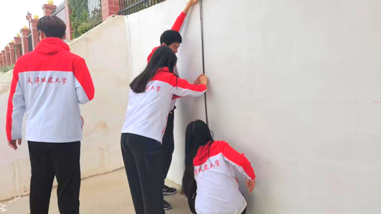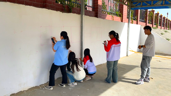 天城大支教团小学组成员、控制与机械工程学院2021级工业设计1班 黄若一表示自己在接到墙绘任务后,第一时间报名参加,并利用在校学科的特长优势提供技术性支持,他说:“能够参加墙绘工作非常激动,也收获了很多。经过前期的实地考察调研以及图稿选择设计,支教团的老师和同学们都付出了不少心血和努力,从反复修改图稿的设计,到测量每幅图稿的大小、定点打稿、上色勾边,在长达2个星期的时间完成了墙绘工作,在这场活动中我收获的不仅仅是学会墙绘的这个技能,更是培养了自己的团队意识,真正地为于田县第二小学办实事”。