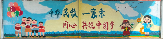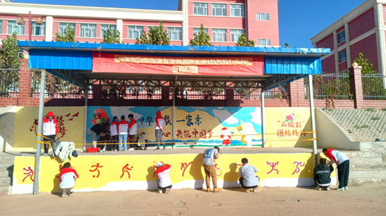 9月18日,经过前期多次实地考察,支教团小学组全体成员发现于田县第二小学的体育场舞台背景急需翻新绘制后主动承担绘制墙面工作。在和校方积极沟通、反复商定后,支教团多次开会研讨,墙面的主题确定为《中华民族一家亲,同心共筑中国梦》。