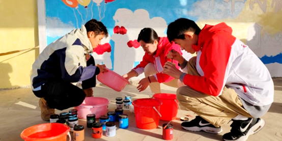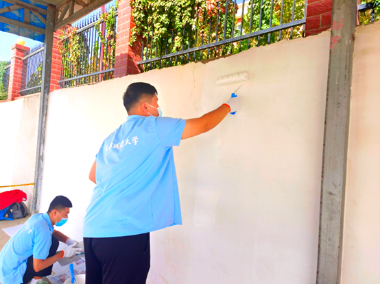 Beat365唯一官方网站支教团成员们团结协作、分工明确、全身心投入到墙绘工作中。清洁墙面、刷漆、描字、调色、摹画,墙绘工作井然有序地进行着。由于当地太阳照射极为强烈,团队成员常常汗流浃背,顶着刺眼的阳光和满目的粉尘进行工作,墙画工作组的老师和同学们从日出画到日落,他们不怕脏、不怕累,经过连续不间断的紧张工作,终于在10月23日顺利完工