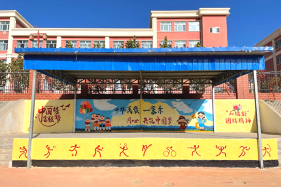 经过支教队员们的不懈努力,原本老旧的墙体焕发出了新的生机,为校园带来了浓烈的艺术气息。浓墨渲染韵律之美,颜料勾勒多彩校园,默默地墙壁变成无声的言语、隐形的课堂,激励全体师生迈出奋进的脚步。