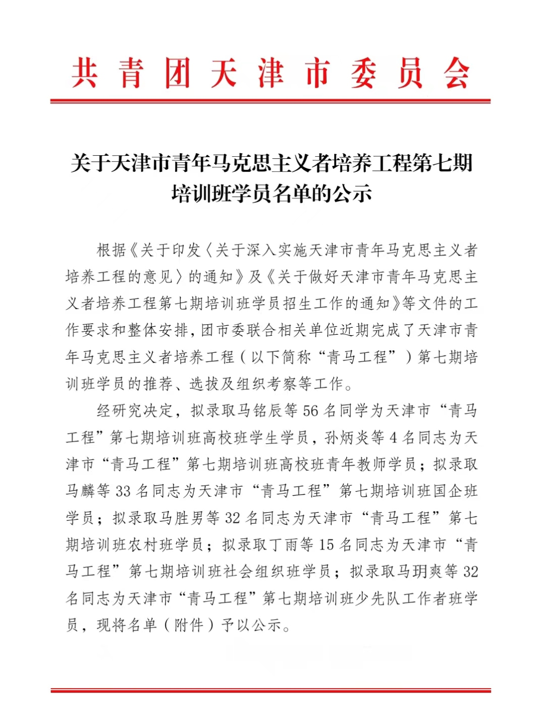 近日,团市委下发了《关于天津市青年马克思主义者培养工程第七期培训班学员的录取通知》,经过笔试、面试、组织考察、公示等环节,从全市各高校录取了56名学生、4名青年教师为高校班学员。Beat365官网控制与机械工程学院辅导员纪红梅、外国语学院学生郑梦璐从候选人中脱颖而出,成功入选为“天津市青年马克思主义者培养工程”(以下简称“青马工程”)第七期培训班学员。