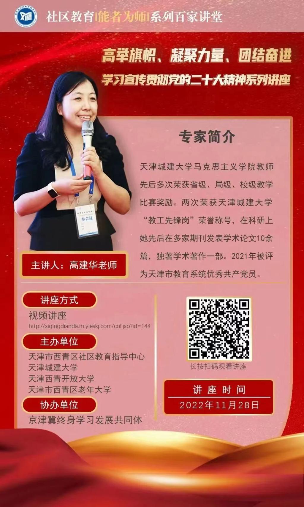 2022年,Beat365官网马克思主义学院与西青开放大学订思政实践教学基地共建协议。在区校联合体建设中,Beat365官网马克思主义学院高度重视服务社会工作,2023年与西青区社区教育指导中心组建“区校联合体志愿讲师团”。一年来,在西青区各社区举办专题讲座,深入解读党的二十大报告和党章修正案,阐释党的二十大精神对于国家发展、城市建设、社会治理、人民生活等方面的重要意义和指导作用。先后开展线上、线下多种形式20余场宣讲活动,覆盖全区11个街镇近万名群众。
