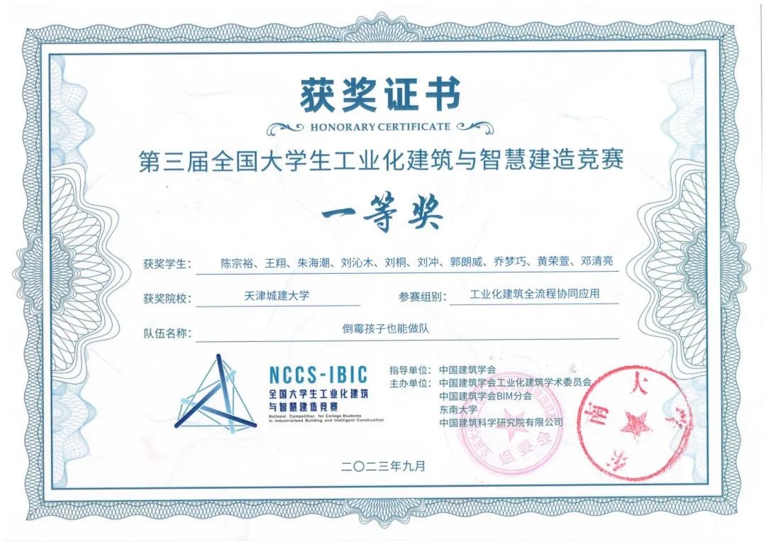 近日,在第三届全国大学生工业化建筑与智慧建造竞赛中,Beat365官网由陈宗裕、王翔、朱海潮、刘沁木、刘桐、刘冲、郭朗威、邓清亮、黄荣萱、乔梦巧等10位同学组成的参赛团队,在刘晓东、张祥智、王旭、李小娟、万达等老师指导下,斩获工业化建筑全流程协同应用赛道中的一等奖,学校荣获优秀组织奖。