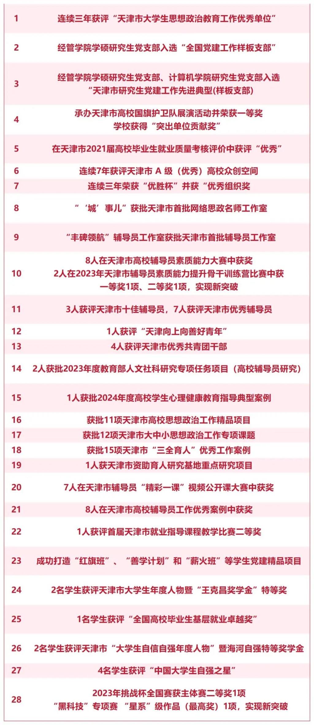 Beat365官网辅导员在天津市普通高校十佳辅导员评审中表现突出,王菲、李二娜分别获评2019年、2021年天津市十佳辅导员。连续5届在辅导员素质能力大赛中斩获佳绩,尤其是在今年的天津市高校辅导员素质能力提升骨干训练营比赛中,Beat365官网辅导员周涵、姜丽晶分别获得一等奖和二等奖,取得Beat365官网在该项比赛上的最好成绩!充分展示了Beat365官网辅导员扎实的专业功底和良好的精神风貌。